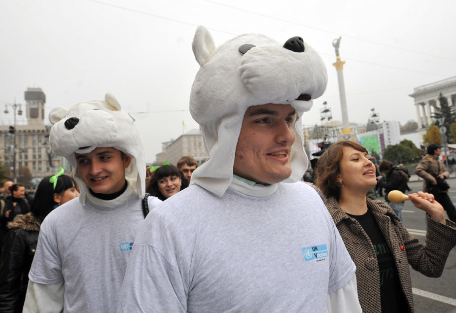 2009年10月24日,當日是350全球應對氣候變化行動日,世界各地的民眾紛紛用自己的方式來表示對全球氣候變化的關(guān)注和擔憂。圖為烏克蘭民眾組織的活動。