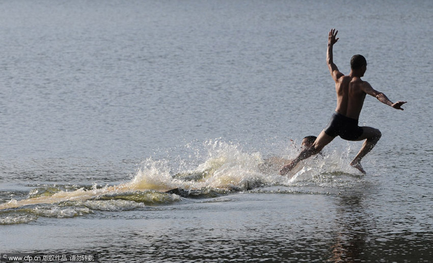 10月22日上午7時(shí)許,釋理亮和他的徒弟用塑料尼龍繩將12塊長1.2米、寬60厘米、厚約0.6厘米的輕薄三合板連在一起,在助跑10多米后,如離弦之箭,蜻蜓點(diǎn)水般地跑過三合板,以極快的速度在水面上“飛”了15米遠(yuǎn),整個(gè)過程不到5秒鐘。林朝陽/CFP