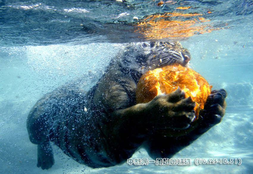 10月28日,美國加利福尼亞州Vallejo,六旗探索王國游樂園里的孟加拉虎在水下撕咬萬圣節(jié)南瓜。>>點(diǎn)擊觀看詳細(xì)內(nèi)容