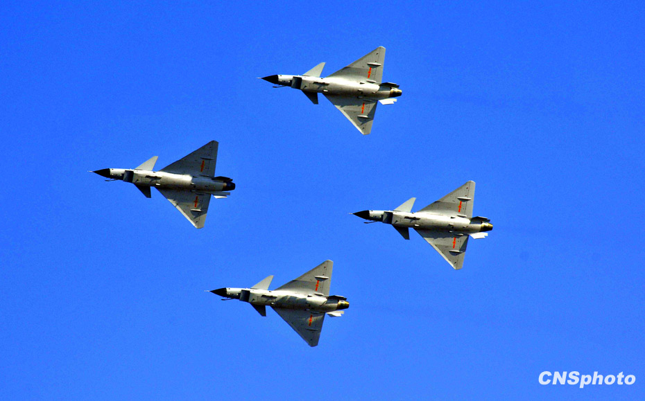 十一月三日,為迎接十一月十一日中國(guó)人民解放軍空軍建軍六十周年,空軍八一飛行表演隊(duì)和空軍八一跳傘隊(duì)在北京沙河機(jī)場(chǎng)舉行了精彩的預(yù)演。圖為殲十戰(zhàn)機(jī)方隊(duì)。 中新社發(fā) 潘旭臨 攝