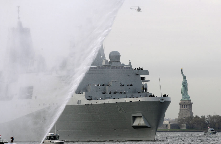 周一(2日),由紐約世界貿(mào)易中心廢鋼建成的美國軍艦駛過自由女神像。來源:中國新聞網(wǎng)