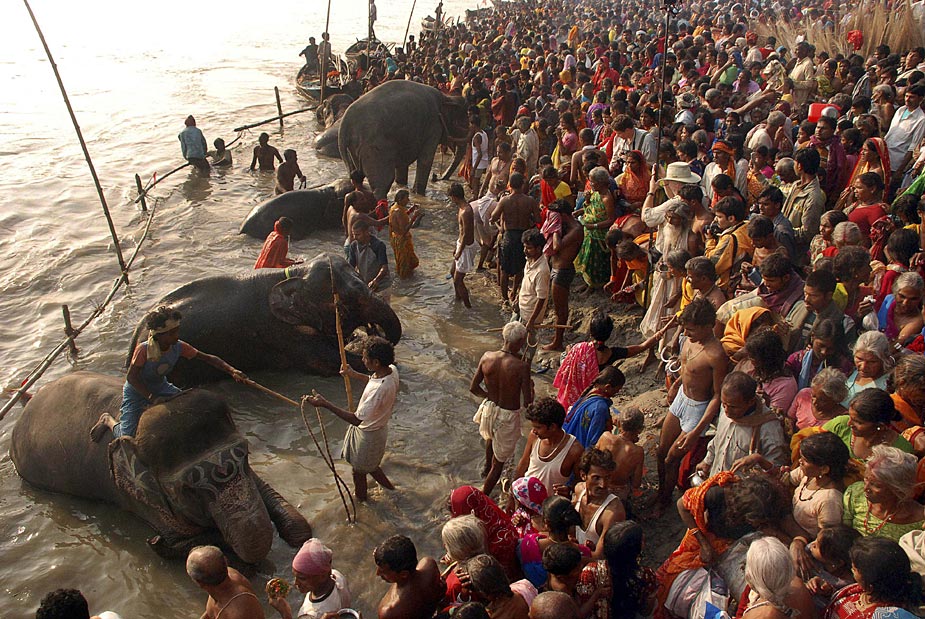 周一(2日),印度教信徒在印度卡爾蒂克為大象沐浴慶祝沐浴節(jié)。來源:中國新聞網(wǎng)