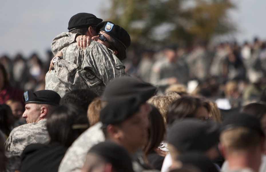 2009年11月10日,在美國(guó)得克薩斯州胡德堡陸軍基地,士兵在悼念儀式上哭泣。當(dāng)日,美國(guó)德克薩斯州胡德堡陸軍基地舉行儀式悼念槍擊案遇難者。 圖片來(lái)源:中國(guó)新聞網(wǎng)