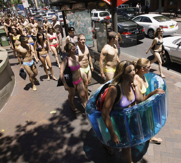 11月12日,約1000人身穿泳裝在悉尼街頭游行,欲打破287人近日在南非創(chuàng)造的最大規(guī)模泳裝游行的世界紀錄。