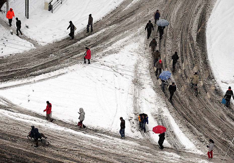11月12日晨,鄭州市民在市區(qū)一個路口的機(jī)動車道上匆匆行走。 連續(xù)的降雪使河南鄭州市區(qū)道路積雪較厚,許多地段還有折斷的樹木擋路,給市民出行帶來不便,很多人只得選擇步行或騎自行車上班。 新華社記者王頌攝 (來源:新華網(wǎng))