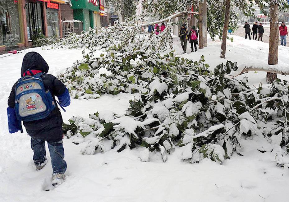 11月12日,一位上學(xué)的兒童從一棵被大雪壓倒的梧桐樹旁走過。 連日來,暴雪不斷襲擊鄭州。大雪給鄭州的交通和群眾生活造成了嚴(yán)重影響。 王頌 攝 (來源:新華網(wǎng))