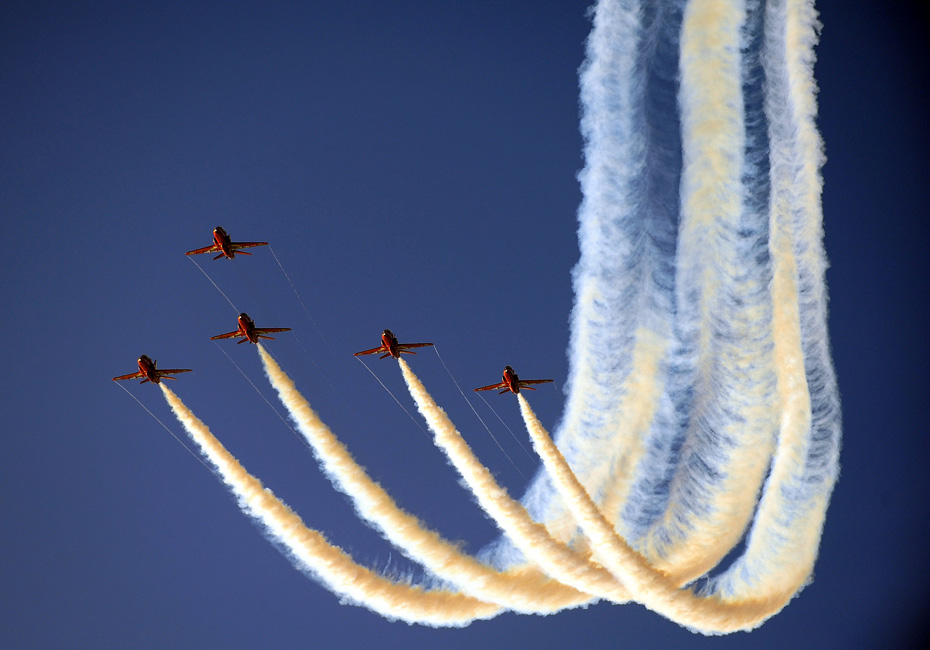 圖為紅箭飛行表演隊(duì)進(jìn)行表演。