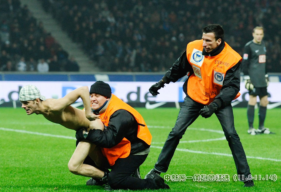 11月8日,09/10德甲第12輪賽事柏林赫塔主場0-1負于科隆,連續(xù)11輪聯(lián)賽不勝。一名憤怒的柏林赫塔球迷沖進球場內(nèi)瘋狂的裸奔。圖片來源:中國新聞網(wǎng)>>點擊觀看詳細內(nèi)容
