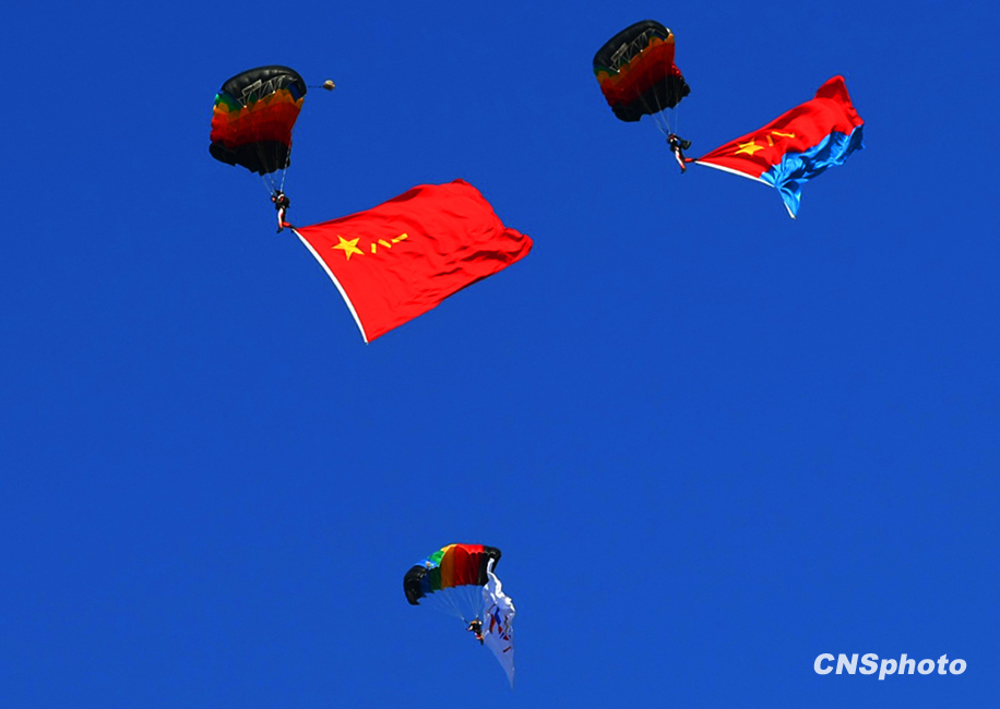 慶祝中國(guó)人民解放軍空軍成立60周年飛行表演,11月15日上午在北京沙河機(jī)場(chǎng)舉行。表演按八一飛行表演隊(duì)4架殲-10飛機(jī)表演12個(gè)動(dòng)作和6架殲-7GB飛機(jī)表演15個(gè)動(dòng)作,分四機(jī)對(duì)頭交叉、四機(jī)菱形隊(duì)大坡度盤(pán)旋、單機(jī)小速度平飛等27個(gè)動(dòng)作,其中四機(jī)對(duì)頭交叉動(dòng)作是這次表演中技術(shù)難度較大的動(dòng)作之一,這是國(guó)產(chǎn)三代飛機(jī)和國(guó)產(chǎn)二代飛機(jī)首次同場(chǎng)競(jìng)技表演?哲娞鴤氵\(yùn)動(dòng)大隊(duì)30名運(yùn)動(dòng)員表演了4個(gè)跳傘科目。中新社發(fā) 宋吉河 攝