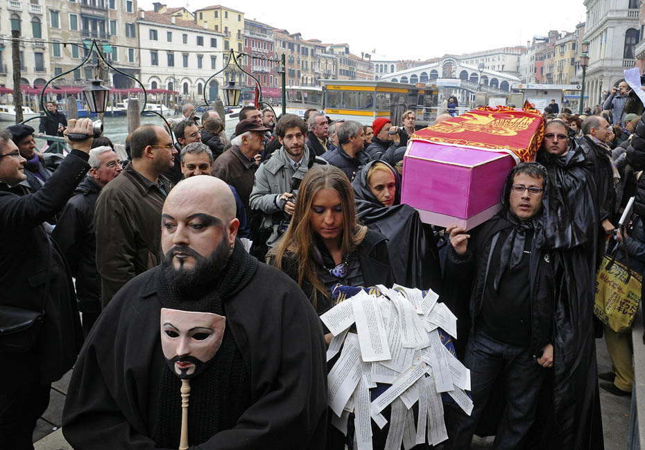 意大利北部歷史名城威尼斯人口跌至6萬以下,當(dāng)?shù)厥S嗟木用?4日替自己的城市安排了一場“葬禮”,希望喚起世人對該市當(dāng)前困境的重視。圖片來源:中國新聞網(wǎng)