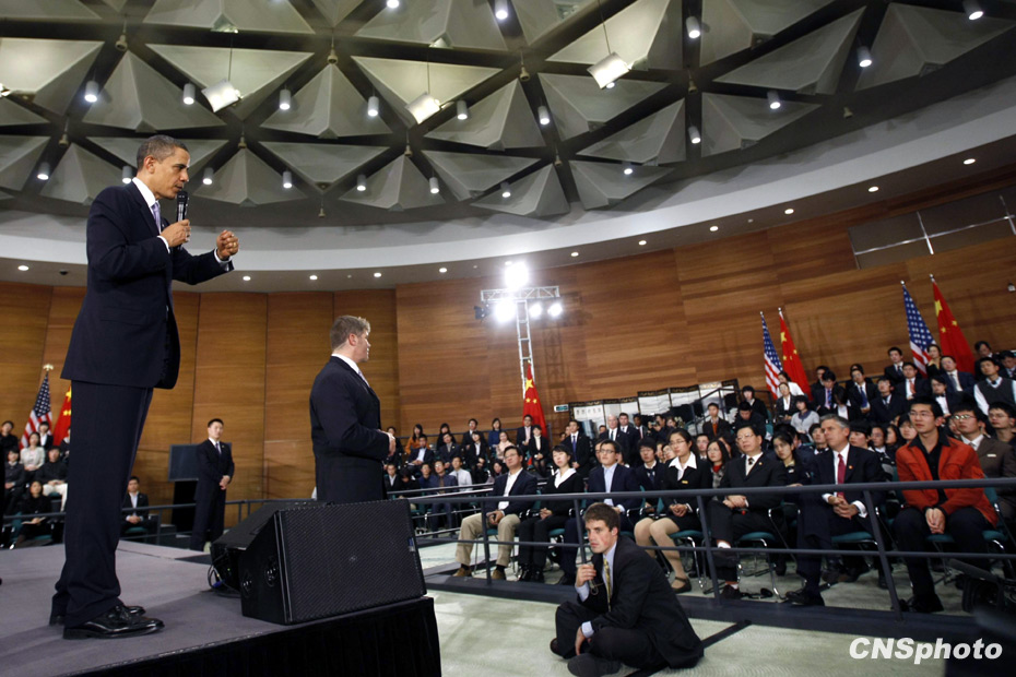 11月16日,正在上海訪問的美國總統(tǒng)奧巴馬現(xiàn)身位于浦東的上海科技館,與四百余中國青年進(jìn)行面對(duì)面交流。 圖片來源:中國新聞網(wǎng)