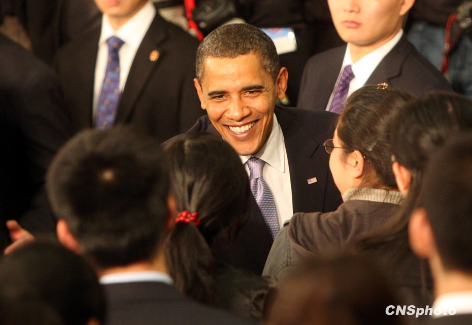 11月16日,正在上海訪問的美國總統(tǒng)奧巴馬現(xiàn)身位于浦東的上海科技館,與四百余中國青年進行面對面交流。 圖片來源:中國新聞網(wǎng)