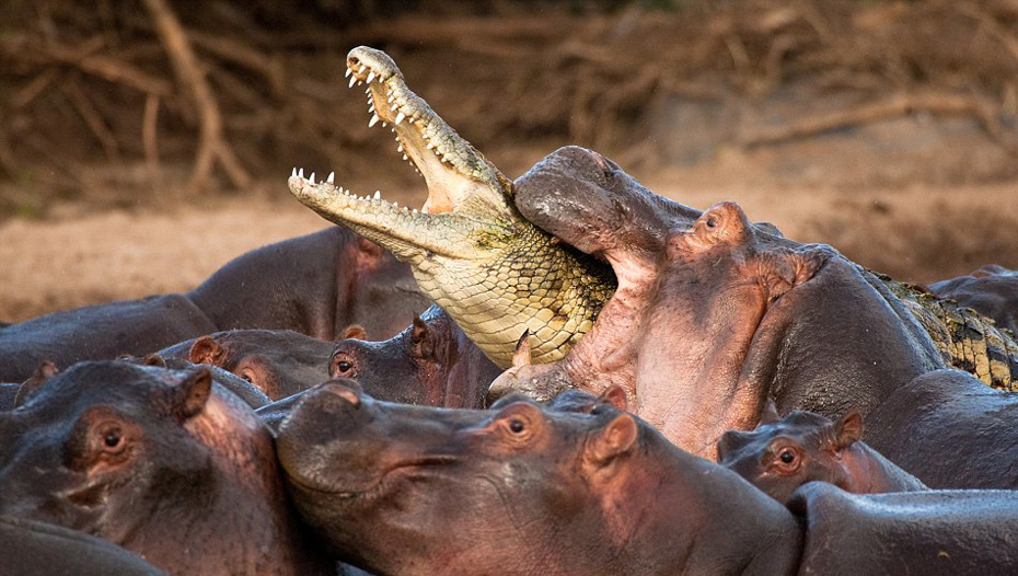 45歲的捷克野生動(dòng)物攝影師Vaclav Silha日前在坦桑尼亞塞倫蓋蒂國(guó)家公園里拍攝到了非常令人震撼的場(chǎng)面。當(dāng)時(shí),一條鱷魚悄悄混入了一群正在河里洗澡的河馬中,但由于與一頭帶著小河馬的河馬媽媽太過接近,它很快就被敏感的母河馬發(fā)現(xiàn)。憤怒的河馬們立刻對(duì)它發(fā)起了猛烈地攻擊,這條冒失的鱷魚很快死于非命。這組照片中的一張最早刊登于英國(guó)廣播公司(BBC)《野生動(dòng)物》雜志的11月號(hào)。