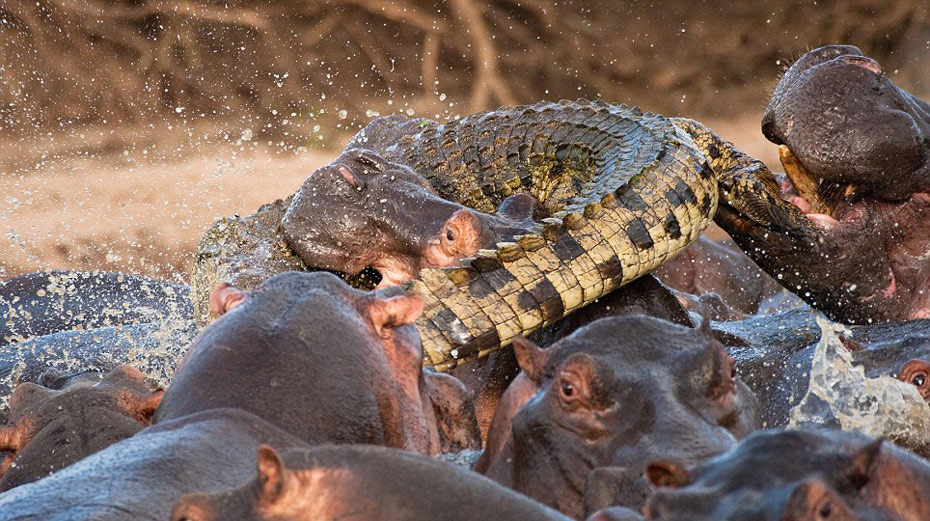 45歲的捷克野生動(dòng)物攝影師Vaclav Silha日前在坦桑尼亞塞倫蓋蒂?lài)?guó)家公園里拍攝到了非常令人震撼的場(chǎng)面。當(dāng)時(shí),一條鱷魚(yú)悄悄混入了一群正在河里洗澡的河馬中,但由于與一頭帶著小河馬的河馬媽媽太過(guò)接近,它很快就被敏感的母河馬發(fā)現(xiàn)。憤怒的河馬們立刻對(duì)它發(fā)起了猛烈地攻擊,這條冒失的鱷魚(yú)很快死于非命。這組照片中的一張最早刊登于英國(guó)廣播公司(BBC)《野生動(dòng)物》雜志的11月號(hào)。