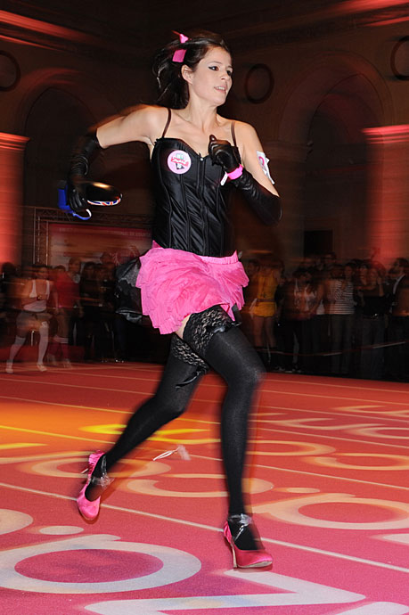 11月20日,法國巴黎舉行了有趣的室內(nèi)高跟鞋賽跑比賽,總共32支隊(duì)伍96人一爭(zhēng)高下。圖片來源:中國新聞網(wǎng)