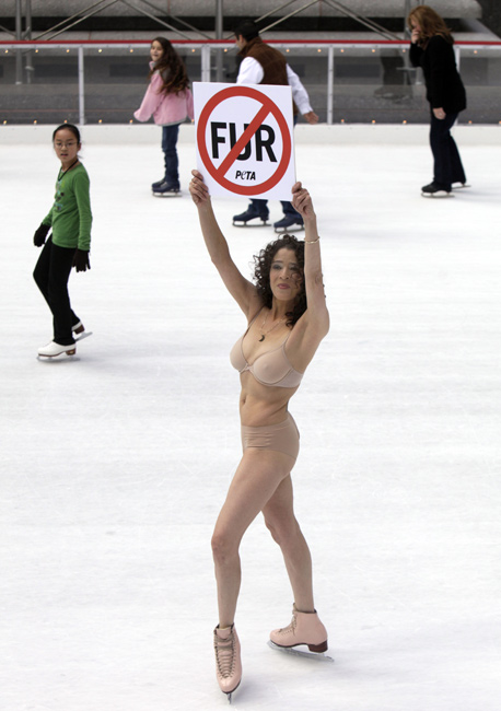 11月24日,美國花樣滑冰的傳奇人物、1979年世界花滑錦標(biāo)賽冠軍得主芭比洛尼在紐約洛克菲勒廣場復(fù)出“裸滑”。這次表演是為了支持善待動物協(xié)會的反對皮草行動。