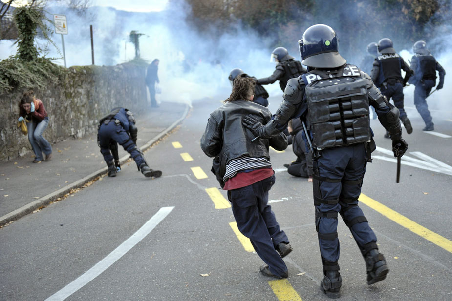 11月28日,在瑞士日內(nèi)瓦發(fā)生的抗議世界貿(mào)易組織的游行活動(dòng)引發(fā)暴力沖突,部分游行者點(diǎn)燃汽車、砸毀商店并與防暴警察發(fā)生沖突。