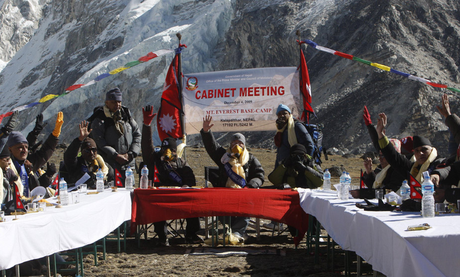 12月4日,尼泊爾總理和22位部長在喜馬拉雅山海拔5262米的高度舉行內(nèi)閣會議,討論全球變暖對喜馬拉雅山的影響。呼吁人們切實采取行動,保護環(huán)境。