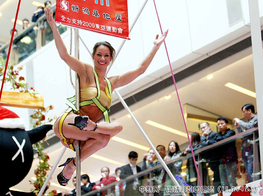 十二月三日,兩項吉尼斯世界紀錄鋼管舞蹈家Nele Sehrt在香港APM商場三十呎高空獻藝,示范一分鐘抱鋼管倒立動作。中新社發(fā) 洪少葵 攝 圖片來源:中國新聞網(wǎng)>>點擊觀看詳細內(nèi)容