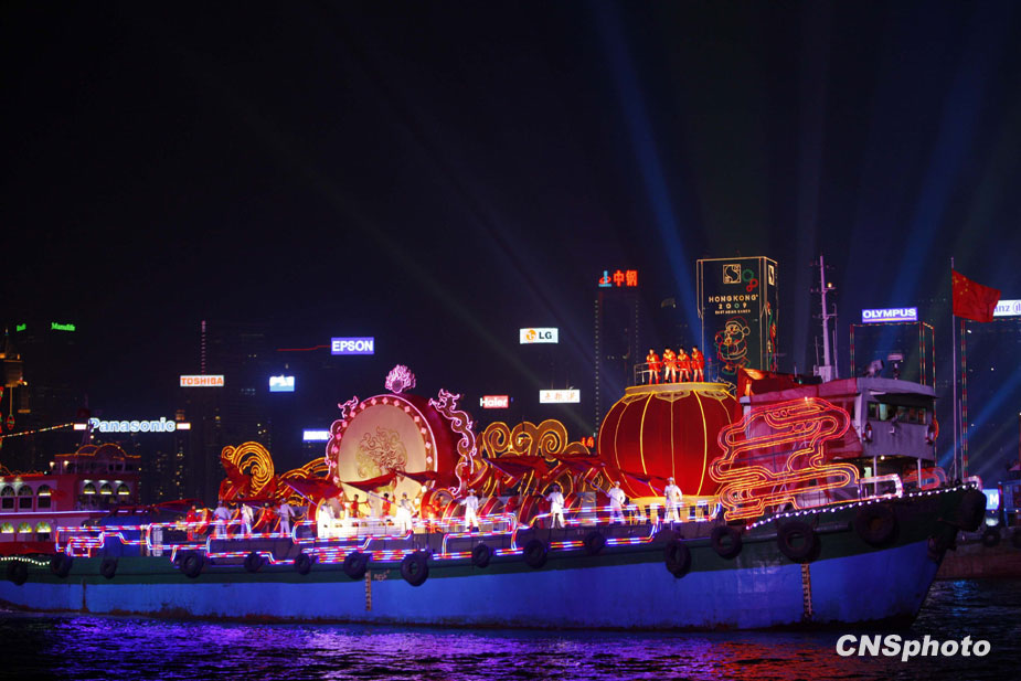 12月5日晚,第5屆東亞運(yùn)動(dòng)會(huì)開(kāi)幕式在香港維多利亞港舉行,同時(shí)配以花船巡游、燈光效果和煙花匯演,成為一屆富有特色的水上開(kāi)幕式。中新社發(fā) 盛佳鵬 攝