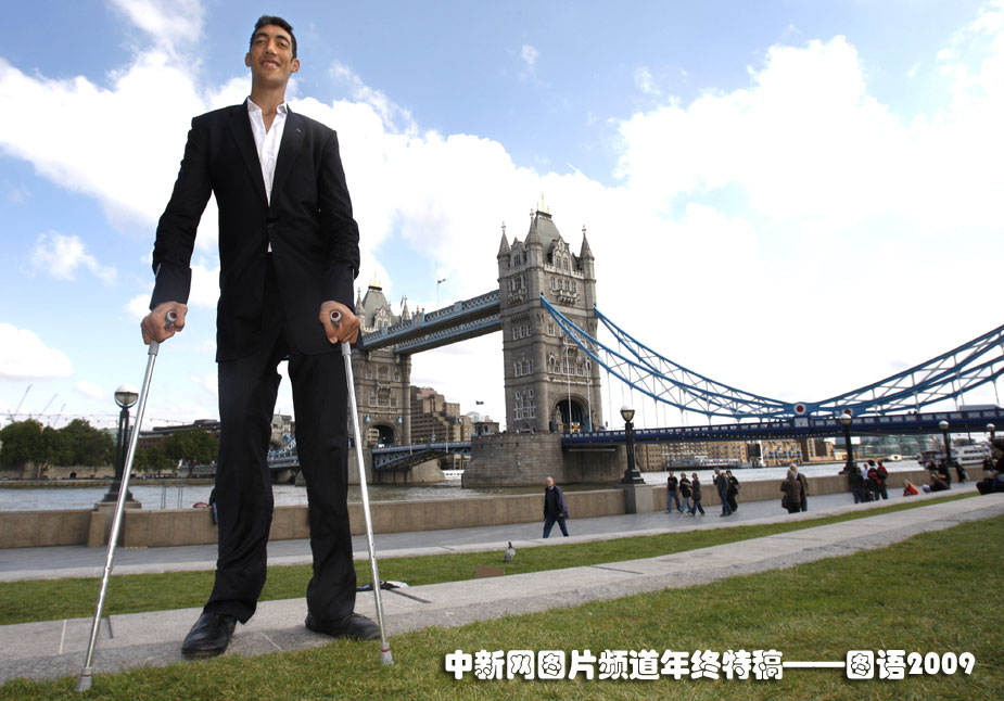 世界最高的人:9月16日,在英國(guó)倫敦泰晤士河傍的塔橋附近,身高2.46米的土耳其農(nóng)民蘇丹·古錢(qián)加冕吉尼斯世界紀(jì)錄“世界最高人”桂冠。圖片來(lái)源:中國(guó)新聞網(wǎng)
