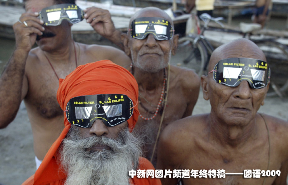 7月22日,印度教眾戴著觀測眼鏡在戶外觀測日食奇觀。