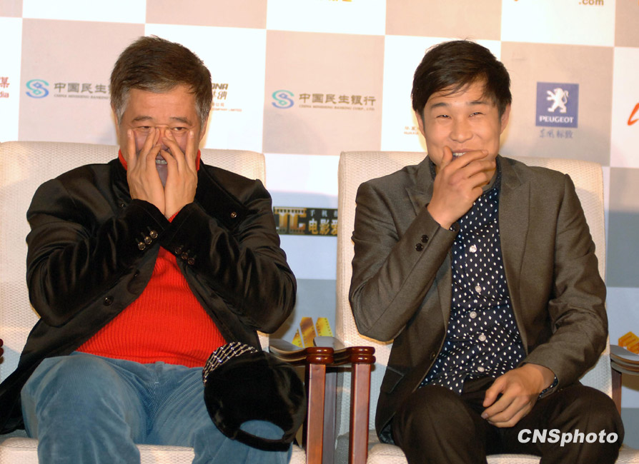 12月9日下午,張藝謀喜劇新作《三槍拍案驚奇》在京舉行首映發(fā)布會,導(dǎo)演張藝謀、大病初愈的趙本山攜孫紅雷、小沈陽、閆妮、倪大洪、程野、毛毛全明星主創(chuàng)團(tuán)隊(duì)齊齊亮相。現(xiàn)場張藝謀、趙本山、小沈陽搞笑不斷,引得爆笑連連,上演了一出戲外喜劇。趙本山首度回應(yīng)了花兩億購買私人飛機(jī)一事,稱還沒有定下來。張藝謀表示會和“趙家班”繼續(xù)深度合作,并且豪言預(yù)計未來的中國電影單部影片票房可能達(dá)到2億美元。圖為趙本山、小沈陽師徒倆現(xiàn)場幾乎笑的“失態(tài)”。中新社發(fā) 李學(xué)仕 攝
