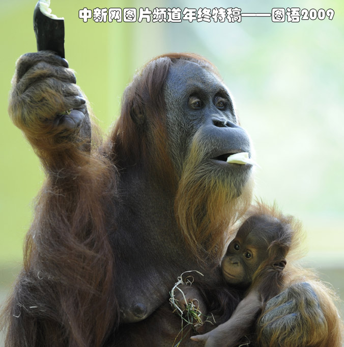 德國慕尼黑的一家動(dòng)物園里,一只紅毛猩猩懷抱著它四個(gè)月大的“寶寶”。