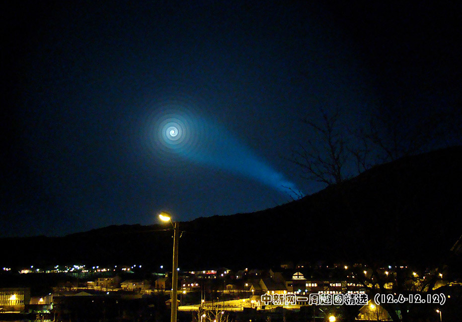12月9日,挪威北部特羅姆瑟市上空發(fā)現(xiàn)不明“藍(lán)色發(fā)光螺旋狀”現(xiàn)象。圖片來源:中國新聞網(wǎng)>>點(diǎn)擊觀看詳細(xì)內(nèi)容