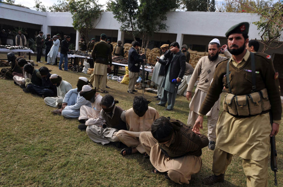 12月12日,在巴基斯坦西北部開(kāi)伯爾部落地區(qū),巴基斯坦軍方抓獲多名塔利班武裝分子,繳獲大量軍火。圖片來(lái)源:中國(guó)新聞網(wǎng)
