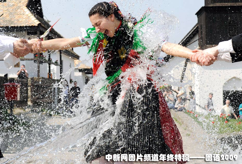 匈牙利迎接復(fù)活節(jié)“水潑美女”——4月9日,在布達(dá)佩斯東北部的一個小鎮(zhèn),當(dāng)?shù)鼐用裱菥毩藗鹘y(tǒng)舞蹈和潑水活動,身著傳統(tǒng)服裝的男孩向女孩們身上盡情潑水。