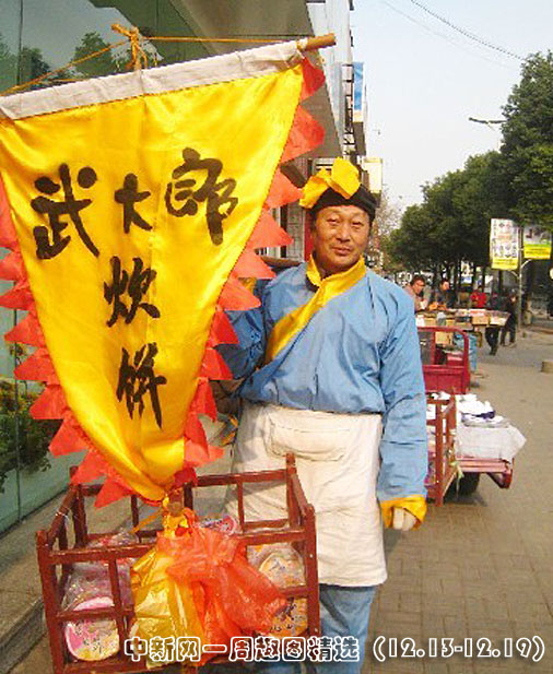12月18日,46歲的山東省陽谷縣李振生,身著青衣襟、白圍裙、黃頭巾,肩挑貨擔裝扮成武大郎的模樣在南京街頭走街串巷賣炊餅。圖片來源:中國新聞網(wǎng)>>點擊觀看詳細內(nèi)容