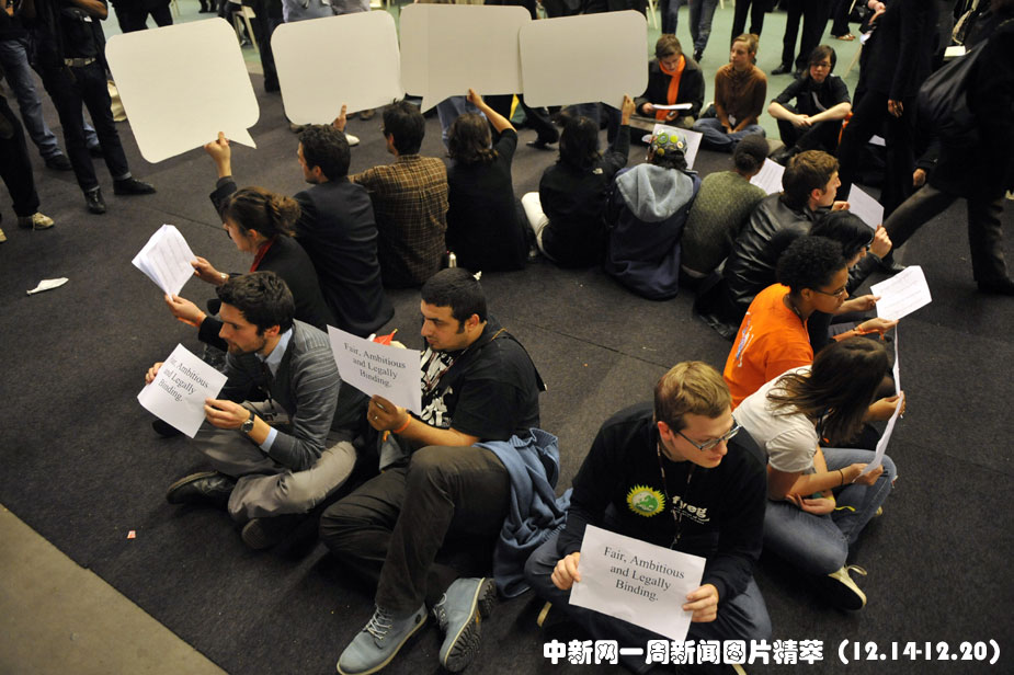 16日(周三),哥本哈根,一群年輕人在貝拉中心靜坐示威,要求聯(lián)合國(guó)氣候變化大會(huì)取得實(shí)質(zhì)成果。圖片來源:中國(guó)新聞網(wǎng)