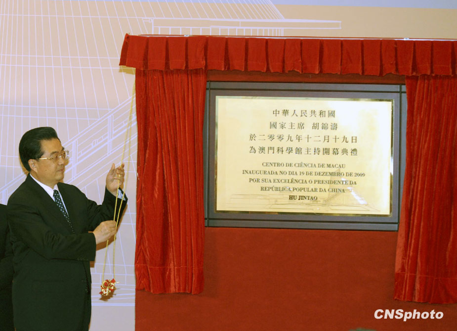 12月19日下午,國(guó)家主席胡錦濤在澳門(mén)出席澳門(mén)科學(xué)館開(kāi)幕典禮并親手為之揭幕。中新社發(fā) 廖攀 攝