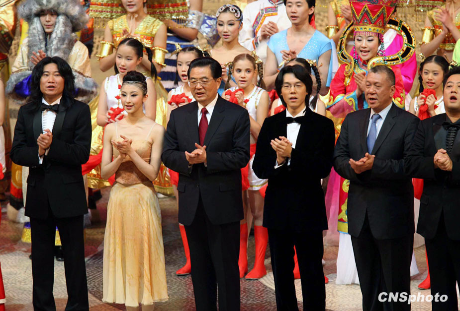 十二月十九日晚,澳門特區(qū)舉行盛大文藝晚會,慶祝澳門回歸祖國十周年。國家主席胡錦濤與演員一起唱響《歌唱祖國》。中新社發(fā) 洪少葵 攝