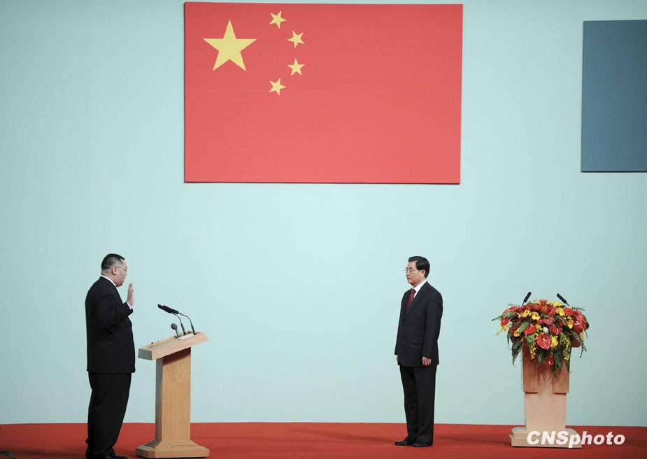 12月20日,慶祝澳門回歸祖國十周年大會暨澳門特別行政區(qū)第三屆政府就職典禮在澳門東亞運(yùn)動會體育館舉行。澳門特區(qū)第三任行政長官崔世安宣誓就職,國家主席胡錦濤監(jiān)誓。中新社記者 廖攀 攝