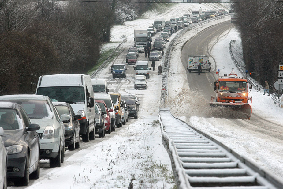 圖為12月18日,大雪導(dǎo)致法國(guó)圣約瑟夫地區(qū)出現(xiàn)嚴(yán)重堵車(chē)。