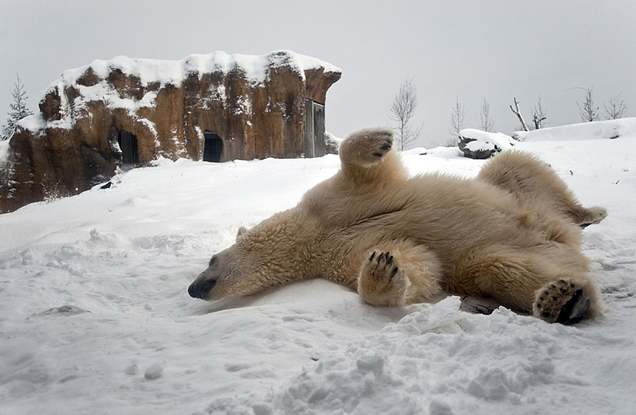 圖為12月20日,荷蘭鹿特丹動物園內北極熊正在享受積雪所帶來的樂趣。