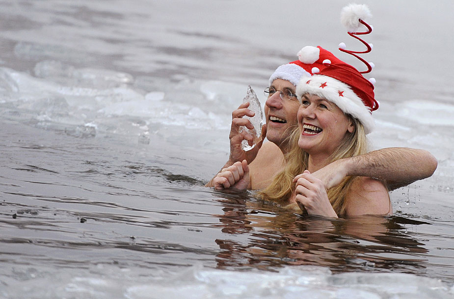 12月25日,德國柏林的冬泳俱樂部“柏林海豹”(Berliner Seehunde)的成員不畏寒冬,光著身子在已經(jīng)結(jié)冰的Oranke湖中暢游一番。圖片來源:中國新聞網(wǎng)