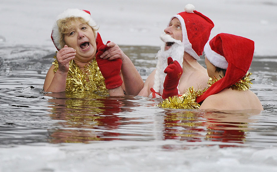 12月25日,德國柏林的冬泳俱樂部“柏林海豹”(Berliner Seehunde)的成員不畏寒冬,光著身子在已經(jīng)結(jié)冰的Oranke湖中暢游一番。圖片來源:中國新聞網(wǎng)