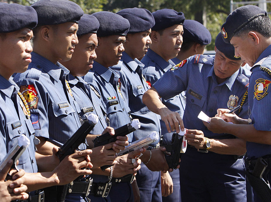 12月29日,菲律賓首都南部的塔吉格市警察部隊為了防止警務(wù)人員在慶祝新年時胡亂開槍,下令用膠紙把槍口封起來。圖片來源:中國新聞網(wǎng)