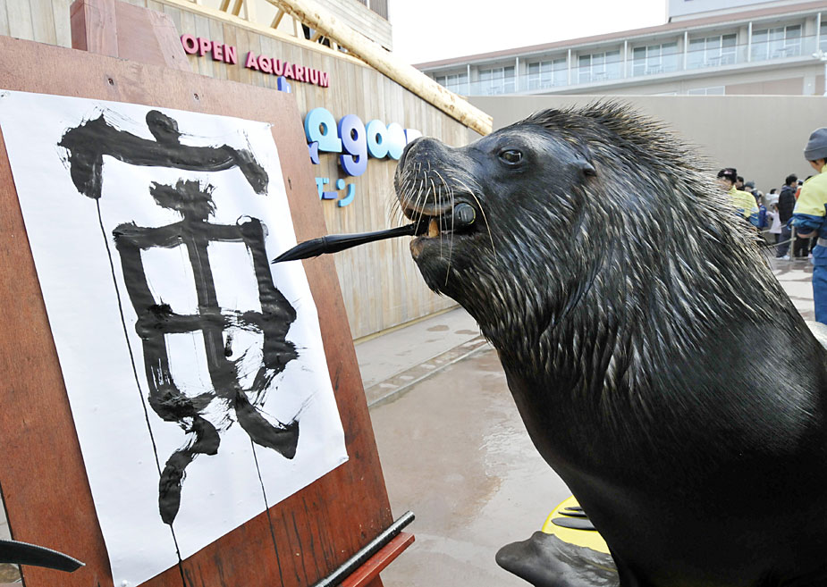 12月30日,日本神奈川八景島海洋樂(lè)園水族館內(nèi),海獅表演了用毛筆在紙上“寫”漢字的節(jié)目。圖片來(lái)源:中國(guó)新聞網(wǎng)