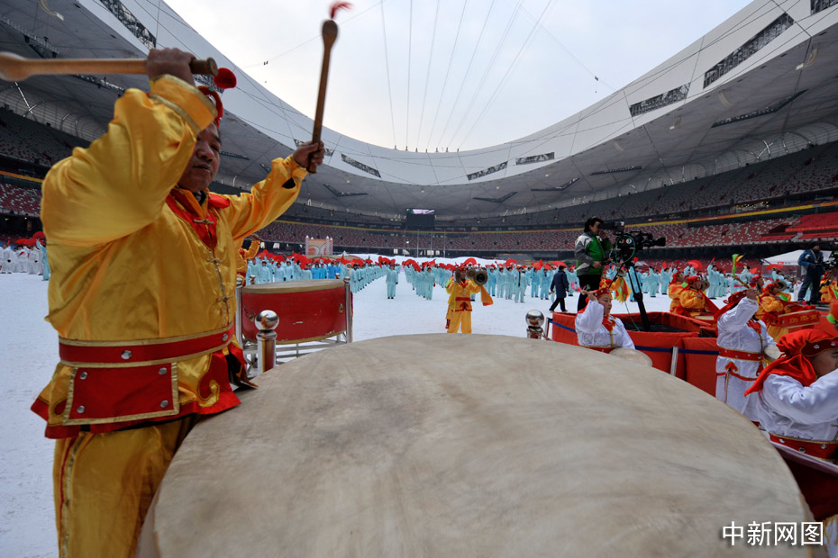 2010年1月1日上午,2010人在被冰雪覆蓋的鳥巢內(nèi)表演了太極拳、武功扇等民族傳統(tǒng)健身項(xiàng)目。中新網(wǎng)記者 金碩 攝
