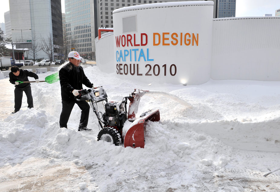 四日,韓國大部分地區(qū)遭遇大雪。至下午二時左右,首爾地區(qū)積雪厚度超過二十八厘米,這是韓國自一九三七年開始進行積雪量觀測以來的最新紀錄。圖為1月5日,民眾在街頭除雪。