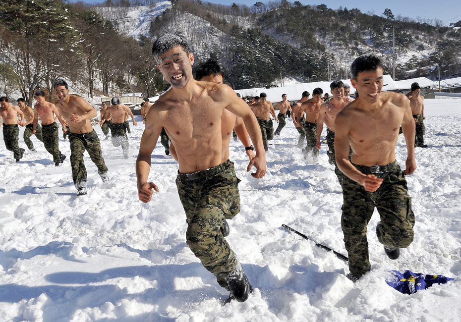 2010年1月8日,韓國(guó)特種部隊(duì)在首爾以東約180公里的雪地上進(jìn)行了冬季實(shí)地演練,官兵們赤膊上陣鍛煉耐寒能力。圖片來源:中國(guó)新聞網(wǎng)