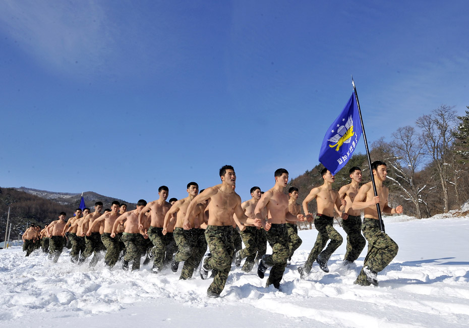 2010年1月8日,韓國特種部隊在首爾以東約180公里的雪地上進(jìn)行了冬季實地演練,官兵們赤膊上陣鍛煉耐寒能力。圖片來源:中國新聞網(wǎng)