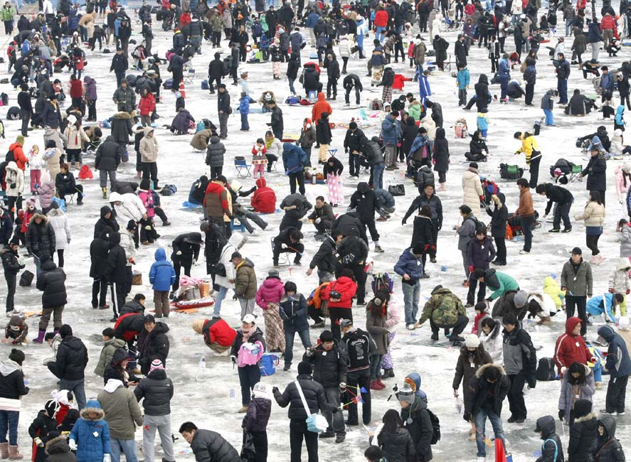 2010年1月9日,韓國華川郡,一年一度的華川山鱒魚節(jié)當(dāng)日舉行。數(shù)千游客在此“破冰”比賽釣鱘魚。該活動(dòng)每年都會(huì)吸引上百萬游客前來。