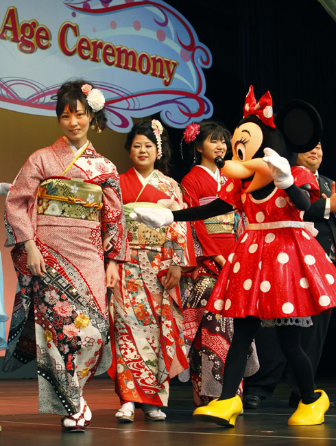 1月11日,日本迎來2010年的成人節(jié)日,所有年滿20歲的年輕人都將在這一天宣告自己邁進(jìn)了成人行列。眾多年輕的日本女孩身穿和服在東京迪斯尼樂園里快樂游玩,迎接自己的節(jié)日。圖片來源:中國(guó)新聞網(wǎng)