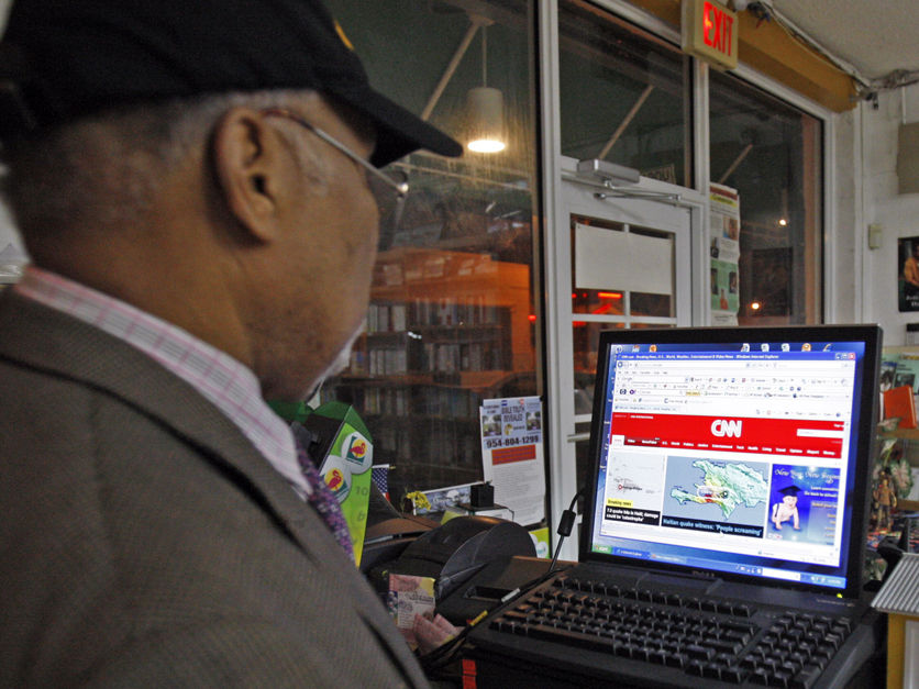 當(dāng)?shù)貢r(shí)間12日下午,海地發(fā)生7.0級(jí)強(qiáng)烈地震,多座建筑損毀。在美國(guó)邁阿密,一位民眾通過網(wǎng)絡(luò)查看海地大地震的消息。