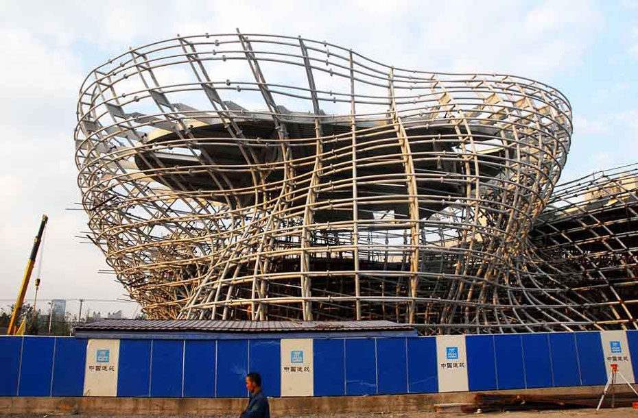 2010年1月21日上海迎來世博會(huì)開幕倒計(jì)時(shí)100天。世博會(huì)場(chǎng)館建設(shè)進(jìn)入最后沖刺階段,部分場(chǎng)館已形象初顯。圖為“藤條籃子”造型西班牙館。鈕一新/CFP